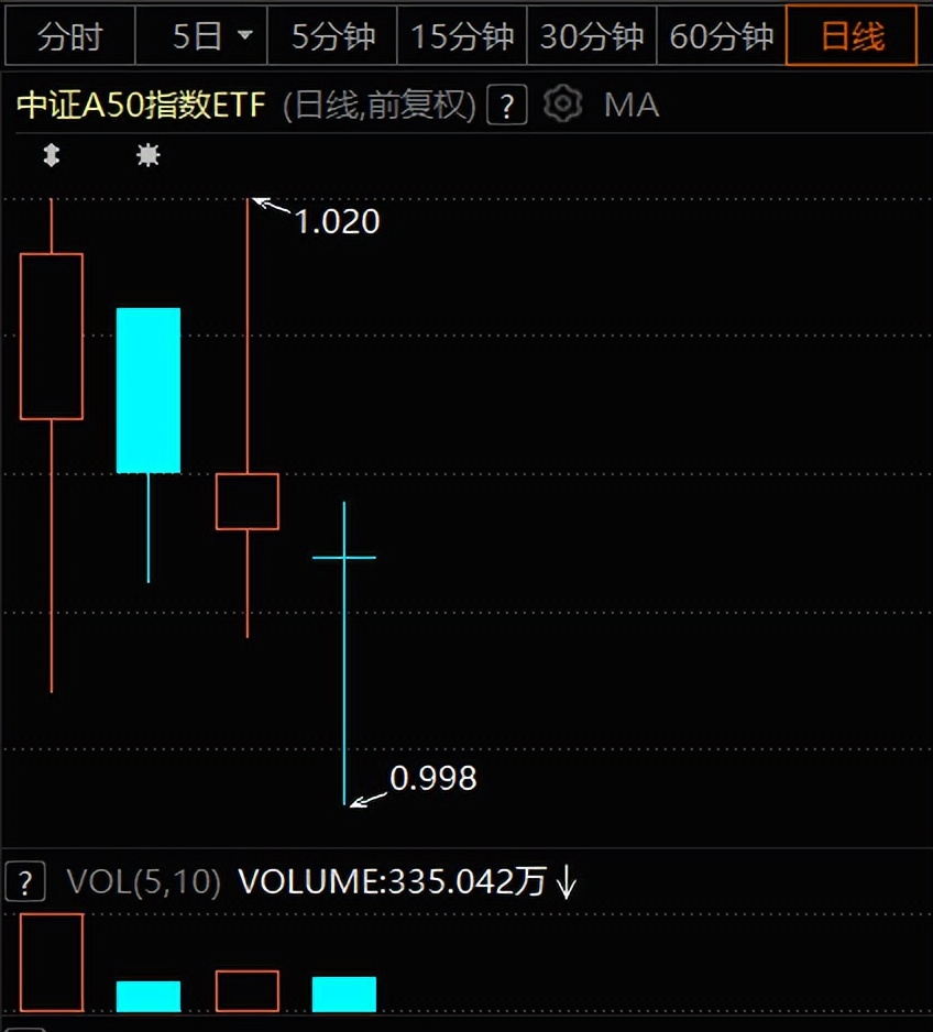 从日K线上看,这只中证A50ETF上市首日收出阳线,这是因为当日开盘价略低,收盘时价格回归上市前一日的基金净值导致。随后几个交易日,平安中证A50ETF的K线,走出震荡下跌组合。