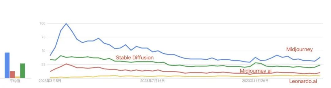 观察 Midjourney 和 Leonardo.ai 的流量走势图可以发现,无论是在流量下滑阶段,还是反弹阶段,Leonardo.ai 的表现都更为坚挺。