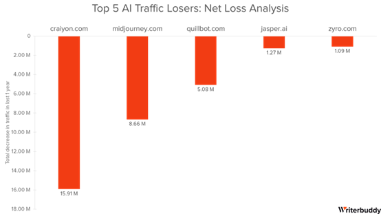 Writerbuddy 统计的流量净损失Top5的AI产品,统计周期:2022 年 9 月-2023 年 8 月