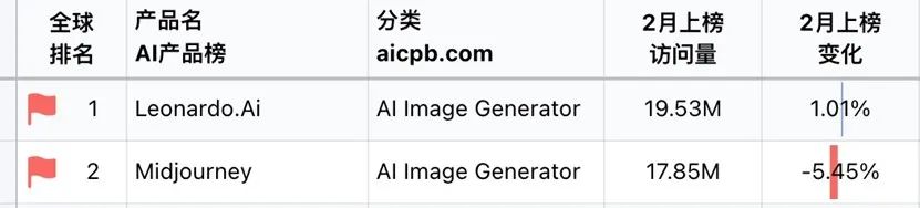在 2024 年 1 月的 AI 产品榜(aicpb.com)中,网站流量一直排在 AI 生图产品榜排名第二的 Leonardo.ai 实现反超,把之前排名第一的 Midjourney 挤下神坛。而在 2 月份,Midjourney 的流量进一步下滑,两款产品之间的流量差距更大了。![]()