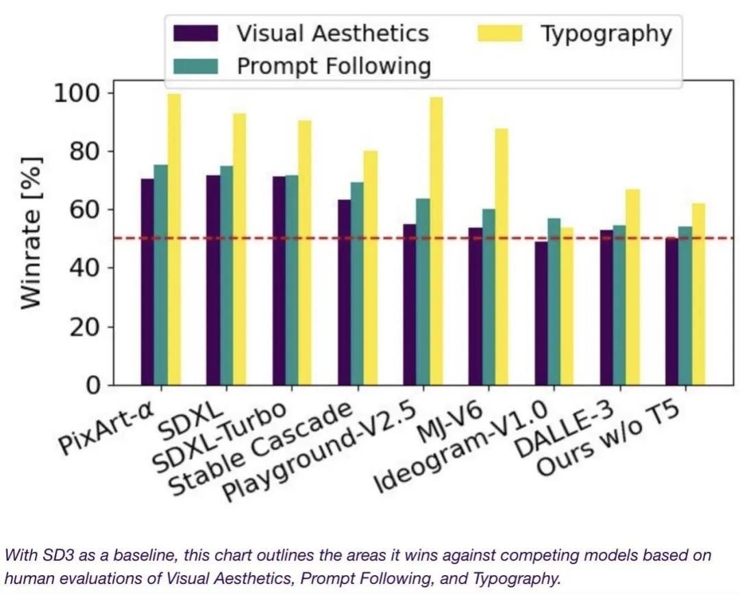 但是 Midjourney V6 推出后不到两个月,Stability AI 宣布推出 Stable Diffusion 3。在论文中 Stability AI 表示,经过测试 SD3 的综合能力高于市面上全部模型。而从图中数据可以看出,在视觉美学、对提示词的理解、图像中文本设计的质量三个维度,SD3 的胜率都超过了 50%,在图像文本生成质量上表现显著优于 Midjourney V6,虽然不排除有 Stability AI 自卖自夸之嫌……