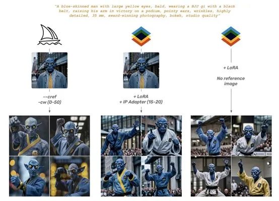 X 上对风格一致性功能的测试,该测试对比了 Midjourney V6 的角色一致性功能和 Stable Diffusion+Lora 的生图角色一致性效果。注:IP-Adapter 是由腾讯 AI 实验室推出的 Stable Diffusion 插件,用来解决角色一致性问题。