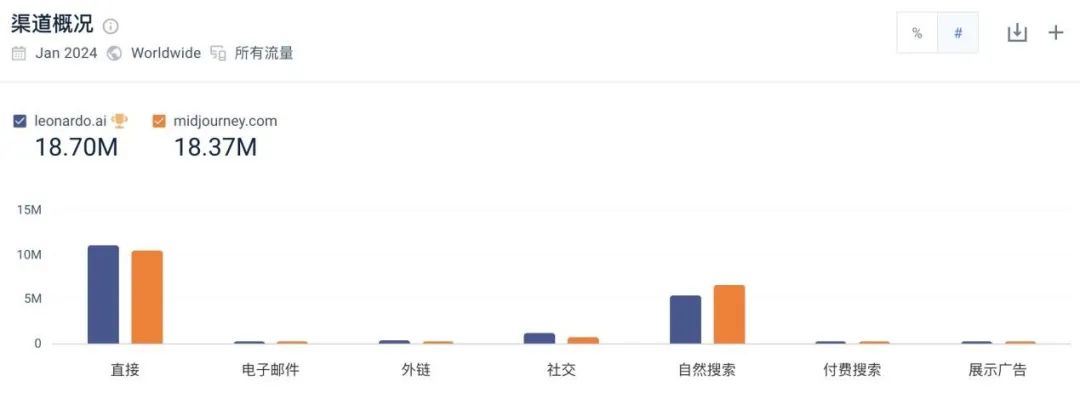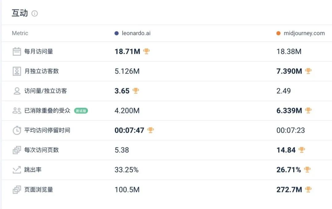 SimilarWeb 数据显示,虽然 Leonardo.ai 在每月总访问量略微领先,但是独立访客数仍低于 Midjourney,而且差距明显,Leonardo.ai 则凭借单个独立访客的月均访问次数更高,所以月访问量才能高于 Midjourney。