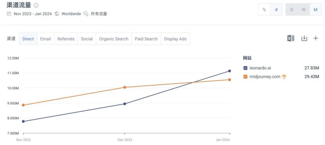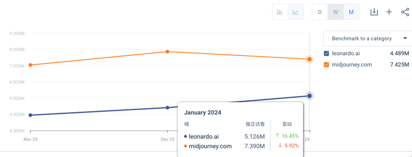 Midjourney 与 Leonardo.ai 近 3 个月独立访客数变化趋势|图片来源:Similarweb