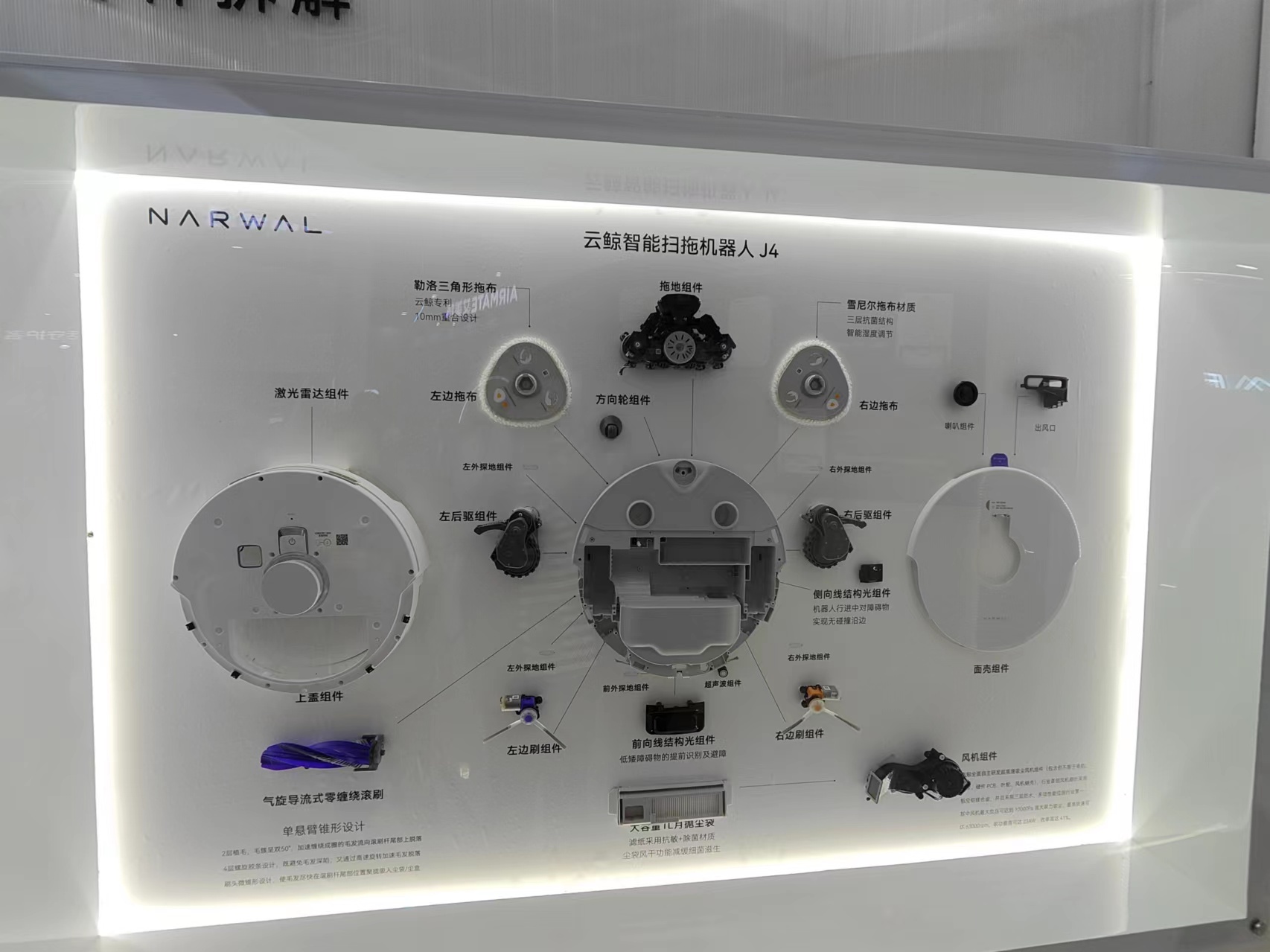 在云鲸展区,云鲸大大方方地把多款扫拖机器人、洗地机拆解成零件,清晰明了地展示出来。通过这种拆解展示,我们从中也能对云鲸的技术能力有了更直观的了解,比如它的扫拖机器人,能做到毛发零缠绕,关键在于它的刷头采用了气旋导流式设计。![]()