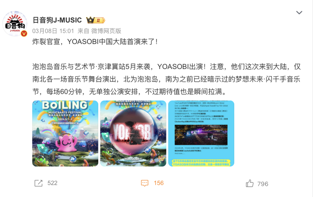 不久前,泡泡岛音乐与艺术节官宣了今年的演出阵容,其中YOASOBI、Tatsuya Kitani、never young beach等海外音乐人立刻吸引了内地粉丝的关注;在仙人掌音乐节的阵容官宣海报中,竟然看到了美国摇滚乐队Fall Out Boy,这也是该乐队首次参加中国大陆音乐节;MDSK音乐节请到了热门日本女子组合XG;而闪千手音乐节的阵容中,几乎一半以上都是海外艺人……