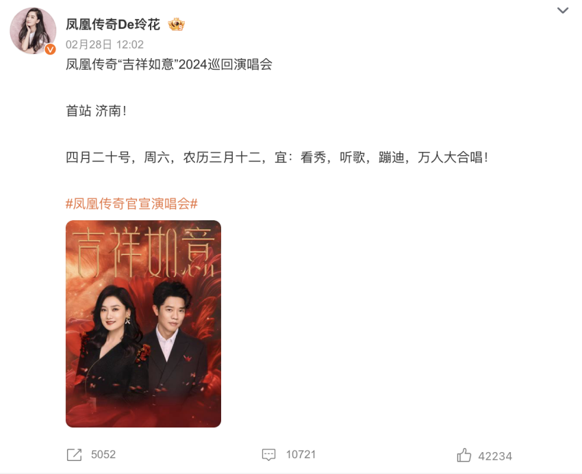 其二,引发过Z世代狂欢的艺人,异军突起。这就不得不提千呼万唤始官宣的凤凰传奇,去年凭借一首“乌蒙山连着山外山”成Z时代顶流的凤凰传奇,从去年起就被喊话“快开演唱会吧!”,甚至还在网上流传着多版本的非官方巡演计划。今年正式官宣后,仅济南场一场就吸引了超80万人的蹲守,可见热度之高。