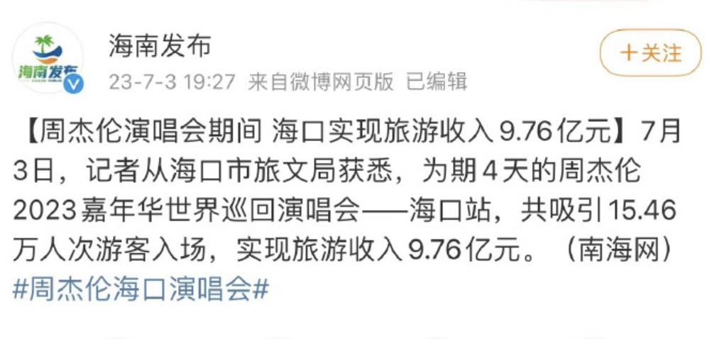 国内也是同样,去年周杰伦在海口为期4天的演唱会,共吸引了15.46万人次游客入场,实现旅游收入9.76亿元;去年TFBOYS十周年演唱会也为西安带来了4.16亿元的收入。