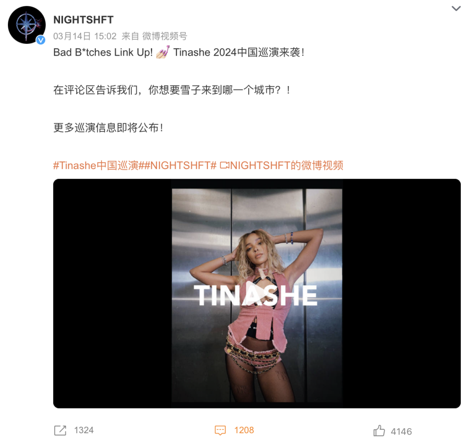 除了参加音乐节,部分知名海外音乐人也陆续官宣了中国巡演行程。不久前,美国歌手Tinashe确定即将开启中国巡演,#Tinashe中国巡演#登上热搜,网友们疯狂喊话来自己城市。此外,泰国歌手BILLKIN个人演唱会“中国香港站”于3月15日开票;新加坡音乐人yeule近日也官宣即将开启中国巡演。