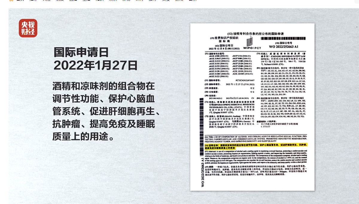据央视记者查询,在世界知识产权组织国际局官网,听花洒提交的《洒精和凉味剂的组合物在调节性功能、保护心脑血管系统、促进肝细胞再生、抗肿瘤、提高免疫及睡眠质量上的用途》在国家处理状态一栏显示空白。