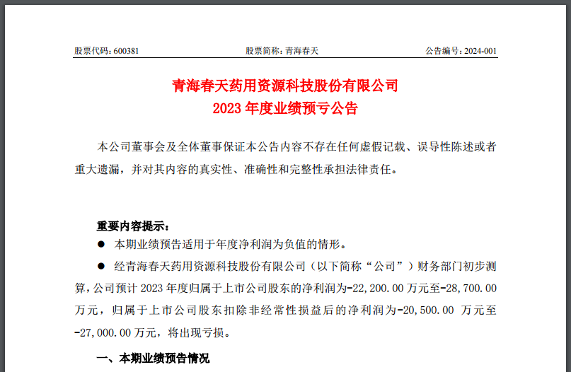 前不久,青海春天已经发布了业绩预亏公告,公司预计 2023 年度归属于上市公司股东的净利润为-22,200.00 万元至-28,700.00万元,归属于上市公司股东扣除非经常性损益后的净利润为-20,500.00 万元至-27,000.00 万元,将出现亏损。