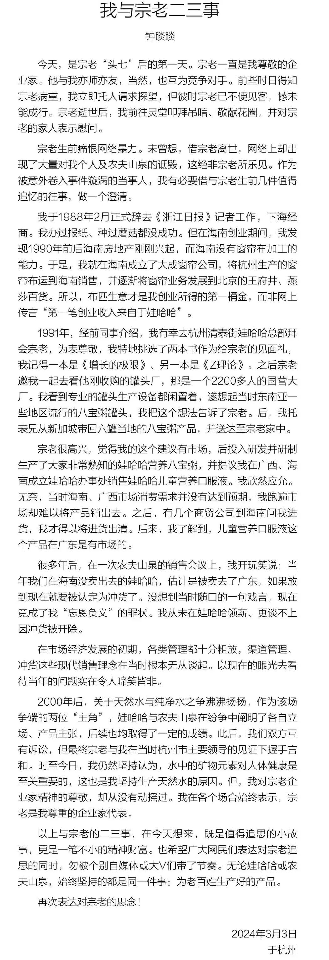 与此同时,作为农夫山泉“背刺”娃哈哈的“天然水”和“矿泉水”一战,回应中也并未有诚恳地提及。回应的时候,钟睒睒儿子钟墅子的国籍问题已经在网上发酵,这篇小作文也对此“避而不谈”。