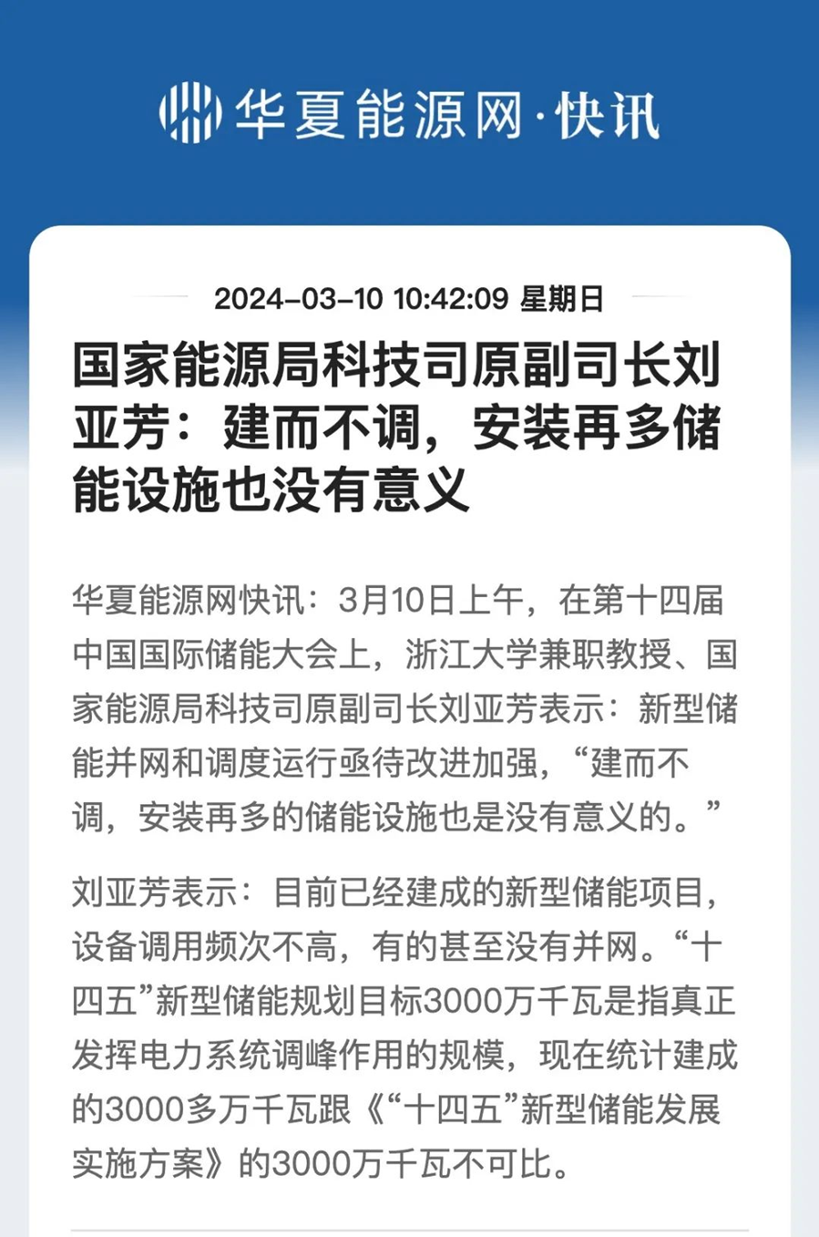 国家能源局科技司原副司长刘亚芳也在公开演讲中呼吁:新型储能并网和调度运行亟待改进加强,“建而不调,安装再多的储能设施也是没有意义的。”刘亚芳指出:目前已经建成的新型储能项目,设备调用频次不高,有的甚至没有并网。