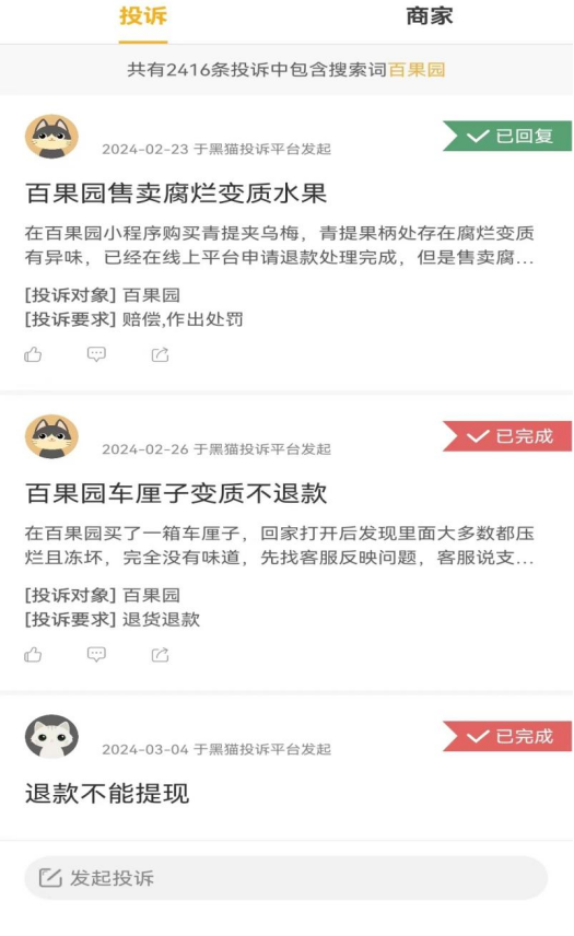 据黑猫投诉平台统计,截至到2024年3月16日百果园共有2416条投诉。比如有消费者反应:“在百果园买了一箱车厘子,打开后大多数是坏的,申请退款而百果园却是一拖再拖,迟迟不给处理”、“百果园卖腐烂水果”等等。强烈引起了消费者不满。