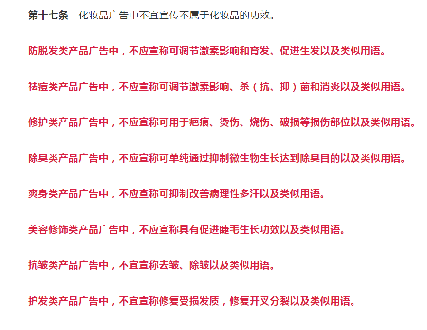 3月6日,上海市市监局和药监局发布关于《上海市化妆品行业广告宣传合规指引》(以下简称《指引》),并自发布之日起实施;其中指出,“化妆品广告中不宜宣传不属于化妆品的功效”,比如:在抗皱类产品广告中,不宜宣称祛皱、除皱以及类似用语。
