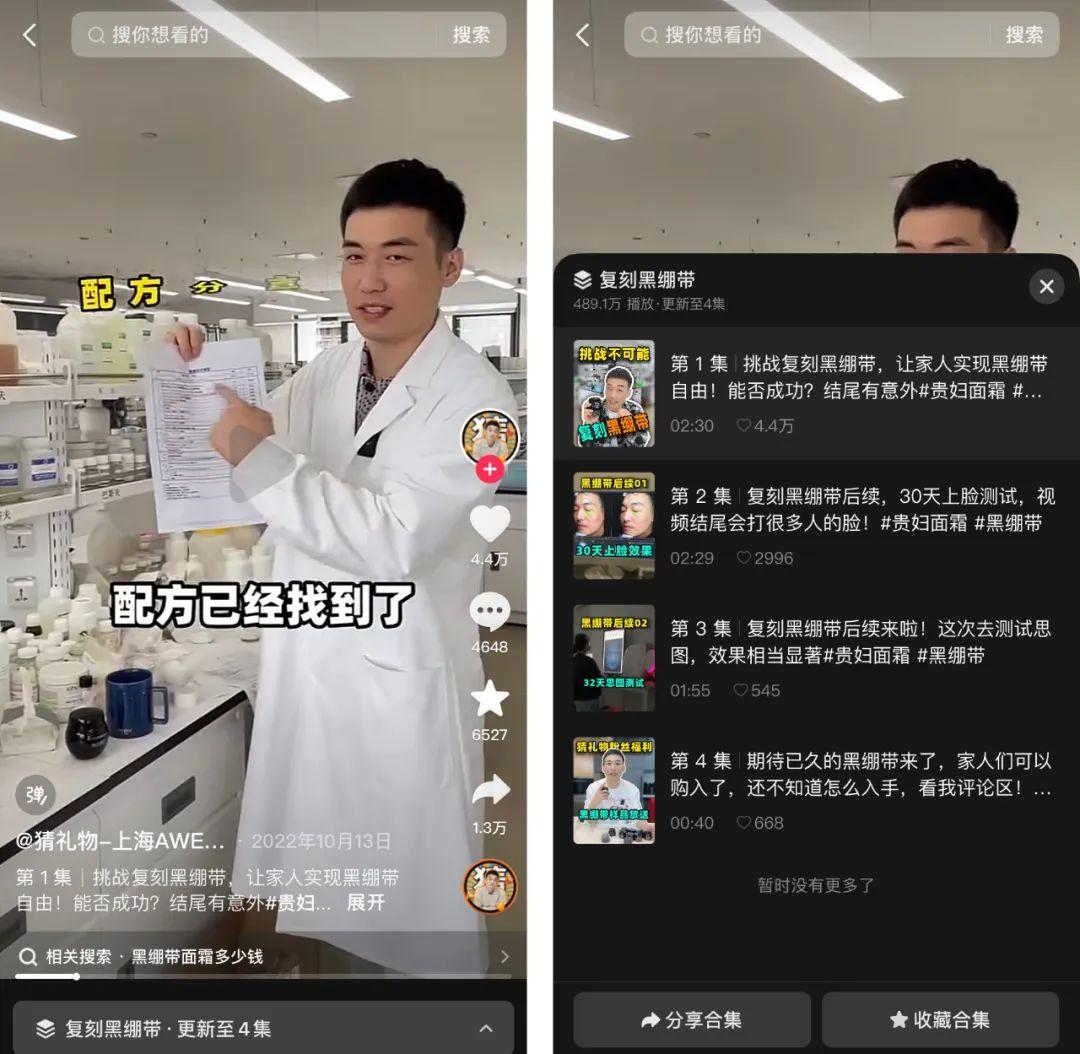 为了博眼球、吸流量,故意利用消费者的认知盲点的“作秀”,在美妆圈并不少见。之前在抖音平台上就有自媒体账号针对知名品牌“赫莲娜HR”的“黑绷带”面霜产品,暗讽其就是“智商税”,声称“黑绷带”并没有那么多科技含量,拍摄了一组“挑战复刻黑绷带、让家人实现黑绷带自由”的视频,并售卖其复刻的“黑绷带”产品。