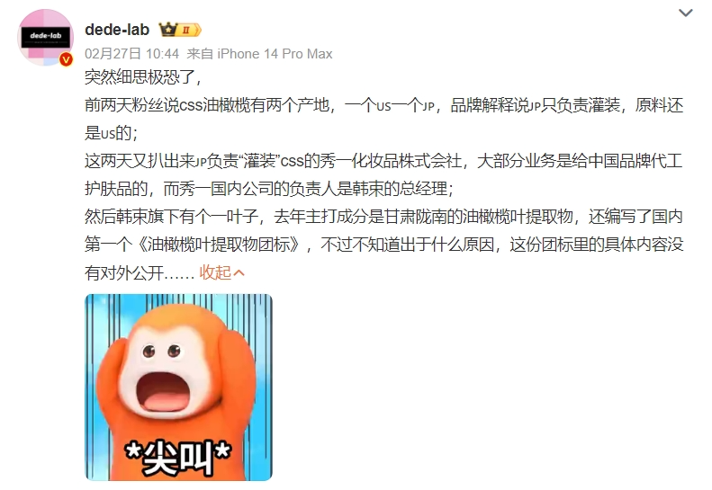 CSS油橄榄被网友扒出有美国和日本两个产地,其中负责“灌装”的“日本秀一化妆品株式会社”实际上大部分业务是给中国品牌做护肤品代工的,而秀一国内公司的负责人竟然是国货美妆集团“韩束”的总经理。