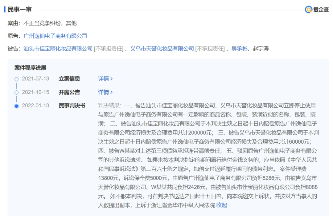 2021年7月,完美日记母公司逸仙电商就曾提起诉讼,称义乌天誉公司在其拼多多网店(店铺名称:NVN0天誉专卖店)销售的口红产品与完美日记此前出品“小细跟”口红包装高度相似,并使用“小细跟”商品名称,销量超过10万件,故索赔100万元。结果法院最终只判处义乌市天誉化妆品有限公司赔偿6万元。