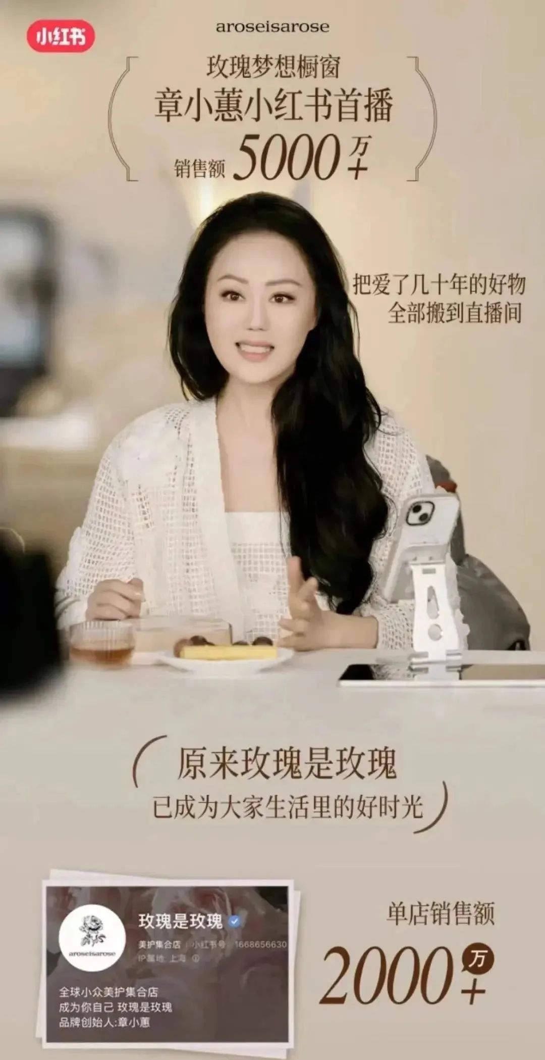 作为小红书的带货达人,章小蕙显然获得平台方更多的流量加持,据小红书数据显示,名为“玫瑰橱窗”的直播有100万人次观看,销售额为5000万+。直播中以章小蕙带货品类包括护肤品、护发品、美容仪等。据小红书官方数据显示,此次直播中有57个销售链接,主播尚未进行介绍就已经售罄。