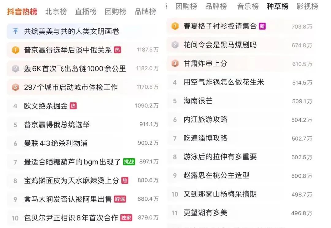 除了老牌搜索引擎百度之外,抖音借助其在短视频、直播领域的海量用户,打造出新晋热门搜索。搜索功能是抖音的重要特性之一,也是吸引更多用户使用抖音的关键之一。在抖音电商和本地生活服务快速成长的过程里,搜索的强大功能不仅促进了内容的多样性和可发现性,也为各个行业提供了新的增长和营销机会,文娱价值官看到,抖音搜索包含了针对商业化的团购榜、品牌榜、种草榜,以及针对营销的影视榜。抖音搜索功能无疑影响着数字营销的新趋势。