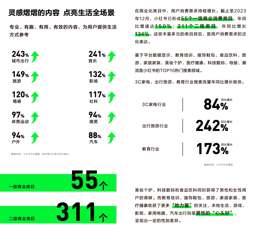 其中,教育培训、服饰鞋包、食品饮料、旅游、家居家装、美妆个护、医疗健康、科技数码、母婴、潮流成为了小红书TOP10热门搜索领域;在搜索流量方面,3C家电行业同比增长84%,教育行业同比增长173%,出行旅游行业同比增长242%。