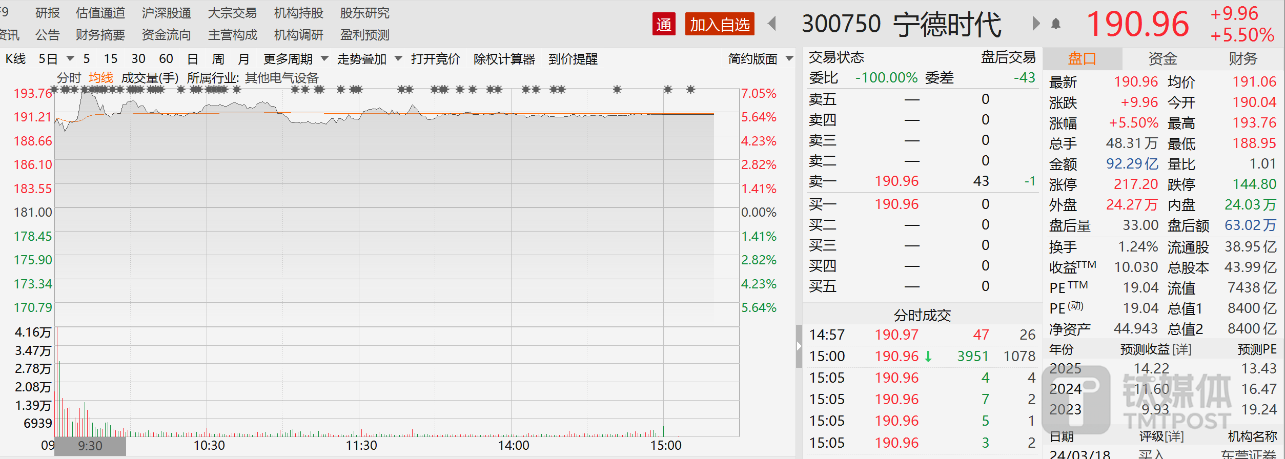 或受此影响,公司股票盘中一度大涨超7%,而之后却出现回落,整体保持高位震荡。截至3月18日收盘,股价收报190.96元,上涨5.5%,总市值8400亿元。