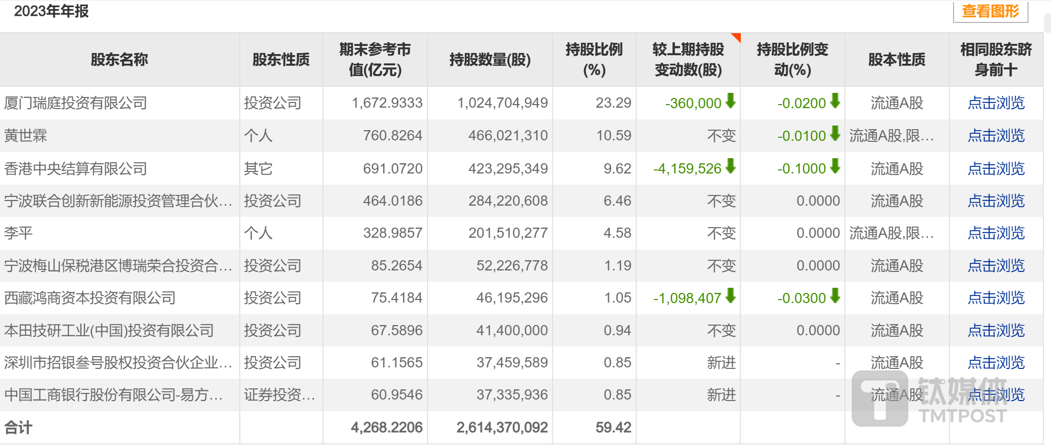 然而,本次超220亿元分红资金,将有近60%会流入公司十大股东的口袋。进一步查询发现,截至2023年12月31日,公司董事长曾毓群旗下厦门瑞庭投资有限公司持股23.29%,前副董事长黄世霖持股10.59%,副董事长李平持股4.58%。若以此计算,三者分别可以获得现金分红51.37亿元、23.36亿元、10.1亿元。