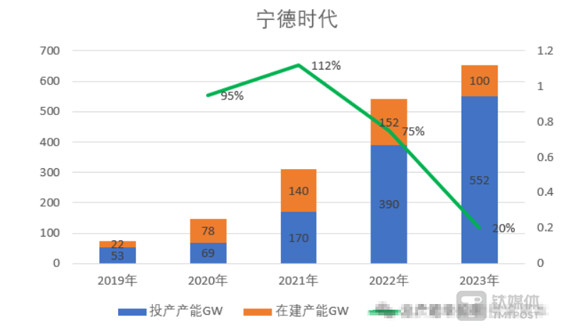 在梳理公司近三年的年报信息后,钛媒体APP发现,自2021年以来,公司产能利用率便在持续下滑。2021年,公司电池系统产能为170.39GWh,当年产能利用率高达95%;2022年,公司电池系统产能提升至390GWh,但产能利用率却下降至83.4%;到2023年,公司电池系统产能可以满足全球近八成动力电池需求,但产能利用率只有70.47%。