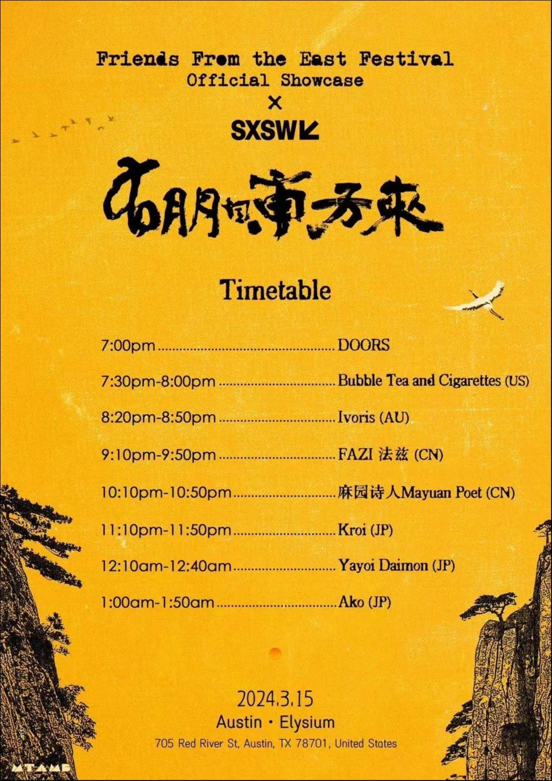 在前两日刚刚结束的美国SXSW(西南偏南)音乐节“Taiwan Beats Showcase”演出上,MongTong、恐龙的皮、Gummy B等来自于台湾地区的音乐人率先结束专场演出;而在3月16日(美国时间3月15日),麻园诗人、法兹乐队与其他亚洲音乐人所参演的SXSW音乐节“Friends From The East Showcase”也于圆满落幕。