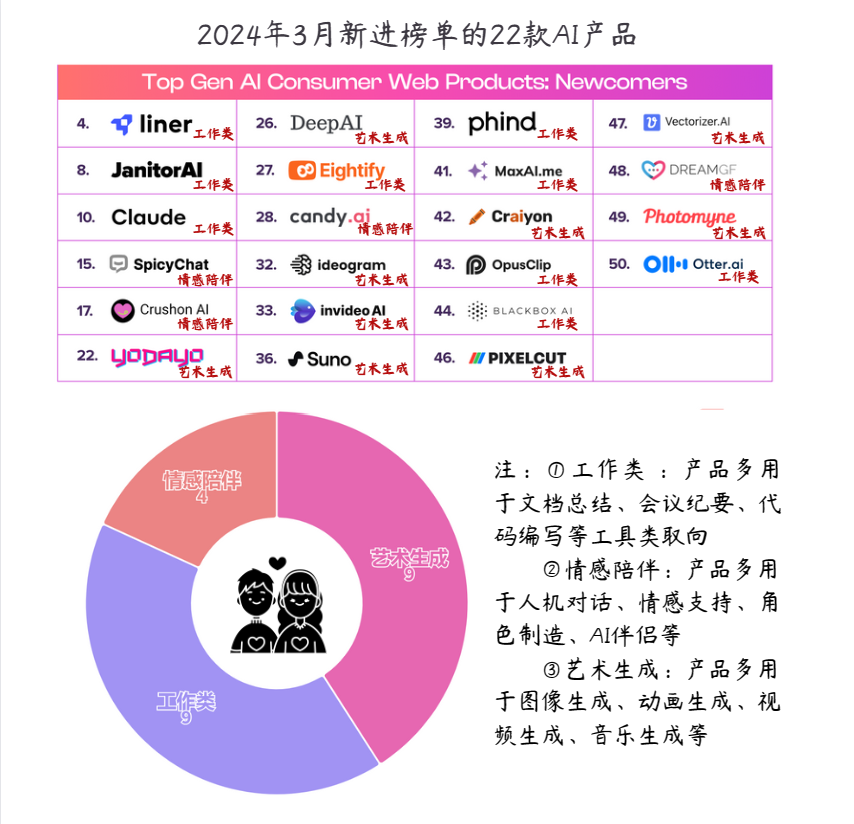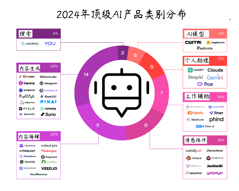 3. AI应用走向垂直性、专业性。根据a16z统计口径,最新月访问量Top50 AI应用榜单里,内容编辑、内容生产、情感陪伴等AI产品占比将近70%,其中音乐AI产品首次上榜。