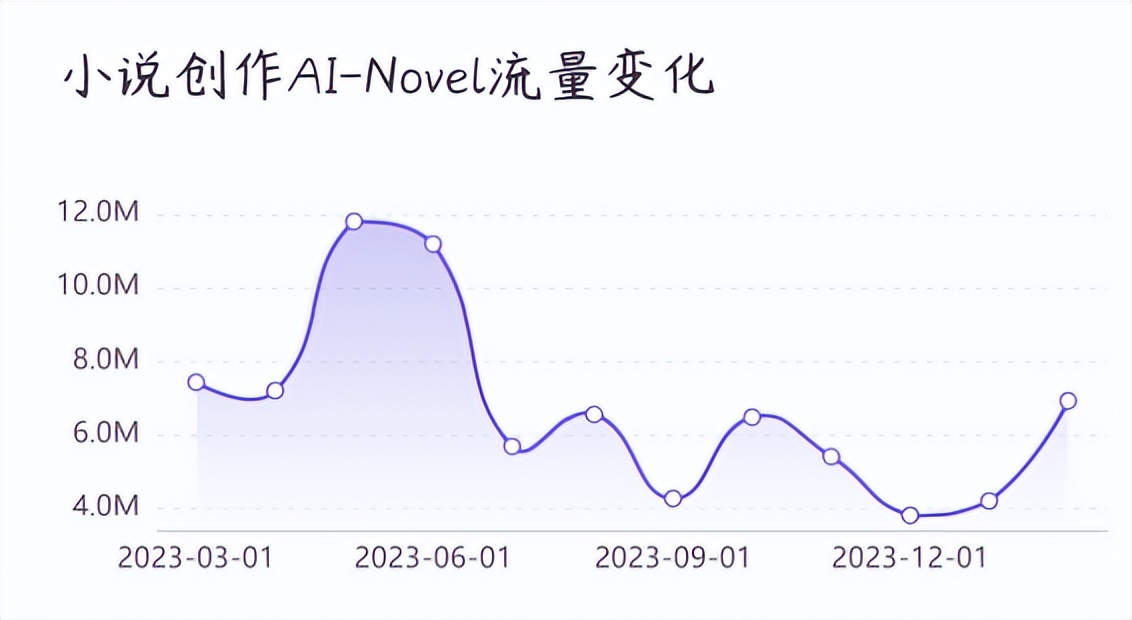 同样受到较大冲击的还有日本AI小说创作产品AI-Novel,由于AI-Novel仅支持日英双语创作,在同类产品的激烈竞争中丧失了优势地位,距离产品发布时将近12M的峰值,流量流失和起伏波动较为明显。