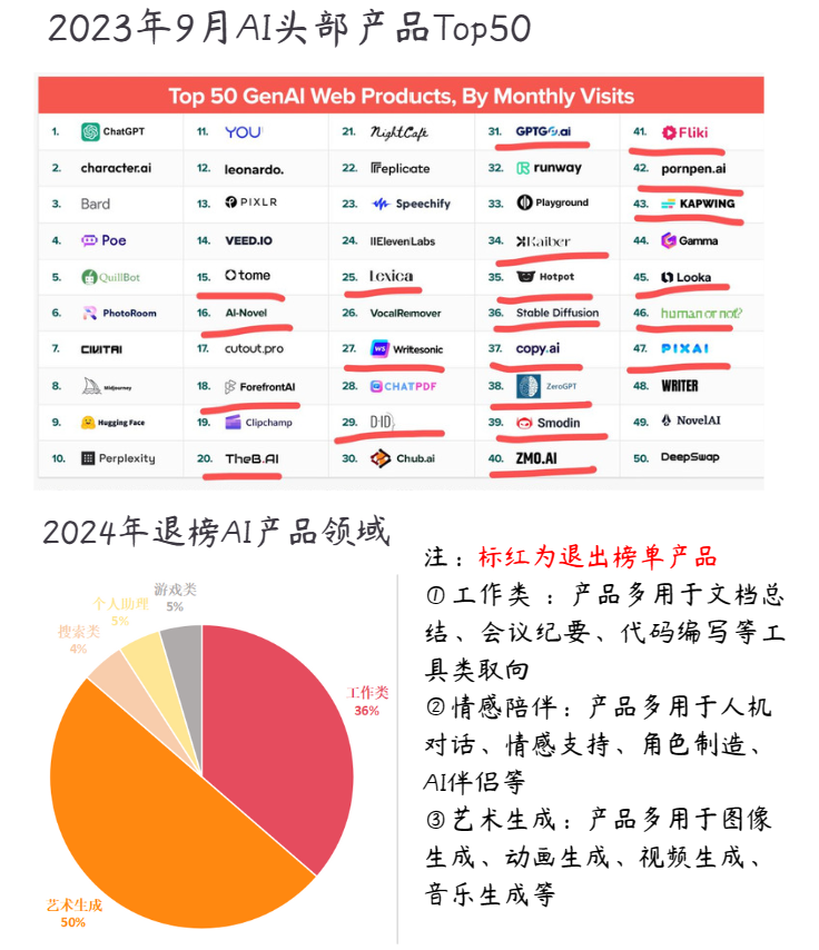 1.过去半年,AI应用进行了一轮大洗牌。与去年9月的榜单相比,最新的Top50 AI应用里出现了22个“新面孔“,也意味着有22个AI产品掉队了。
