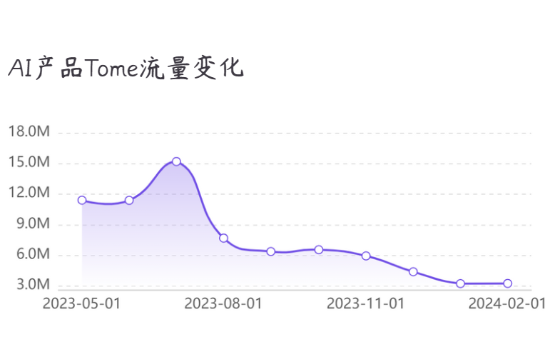 其中,部分设计简单、缺乏人性化体验的产品,在激烈的市场竞争中被用户淘汰。比如,去年九月排名第15的Tome,这是一款专做PPT编辑润色的工作类产品,曾经因其快捷的一键生成PPT能力在AI的PPT编辑领域一骑绝尘,不过随着Gamma等同类产品的竞争、性能优化,Tome的简易PPT模板和仅支持在线编辑的功能已经无法满足用户的需求。Tome也从曾经的PPT AI应用霸主逐渐边缘化,半年内流量流失4.5M。