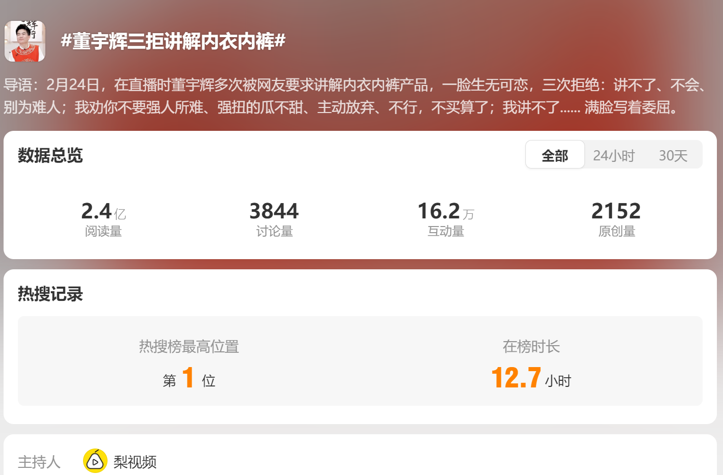 “小作文”风波已证明了流量之反噬,2024年2月底的“拒讲内衣裤”又让东方甄选措手不及。事件起自“与辉同行”直播间上架女性内衣产品,董宇辉拒绝对其进行讲解,表示“讲不了,不会,别为难人”。“董宇辉三拒讲解内衣内裤”随即登上微博热搜,话题阅读量很快超过了2亿,现在则已超2.4亿。