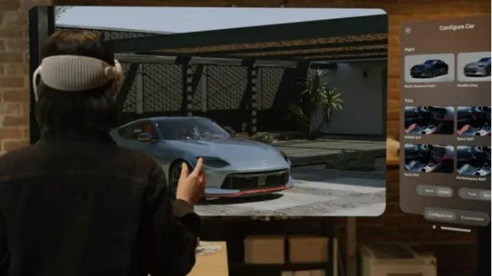 在演示中,一名设计师佩戴Vision Pro,使用CGI工作室Katana在Omniverse平台上开发的汽车配置器应用程序。设计师切换油漆和装饰选项,甚至调整内饰,将三维逼真环境与物理世界融为一体。