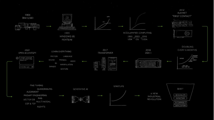 首先,黄仁勋用一张手绘图回顾了计算机产业的发展史,以及英伟达的发家史。从1964年IBM推出世界首个通用计算机开始,伴随着Windows 95、加速计算乃至深度学习模型AlexNet的出现,再到2016年,黄仁勋亲手将第一台DGX-1超级计算机送给了OpenAI。而在2022年,随着聊天机器人ChatGPT横空出世,生成式AI带来了全新一轮产业革命。