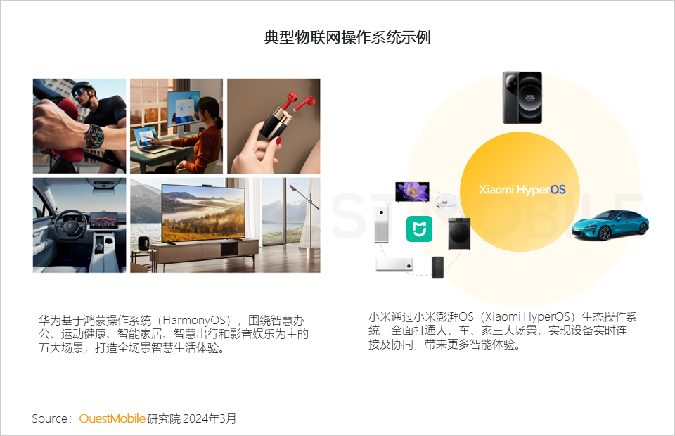 QuestMobile数据显示,截止到2024年1月,全网月活跃用户数为12.27亿,小程序月活用户规模为10.09亿,二者均进入饱和状态,不过,随着物联网、AI等技术发展,以及消费形态变化,跨设备、跨场景应用模式进入快速增长期,智慧互联、智能出行、家庭娱乐三大场景生态正在形成。