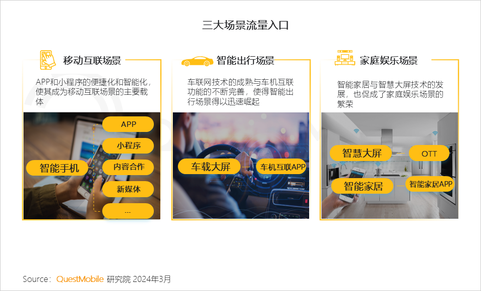 4、科技进步与消费升级驱动移动互联、智能出行、家庭娱乐三大场景生态构建,实现流量多维集聚与共享