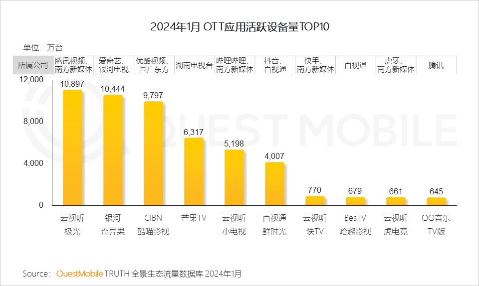 QuestMobile数据显示,截止2024年1月,小米、海信、创维等7家智能电视品牌活跃设备量均在千万级以上。