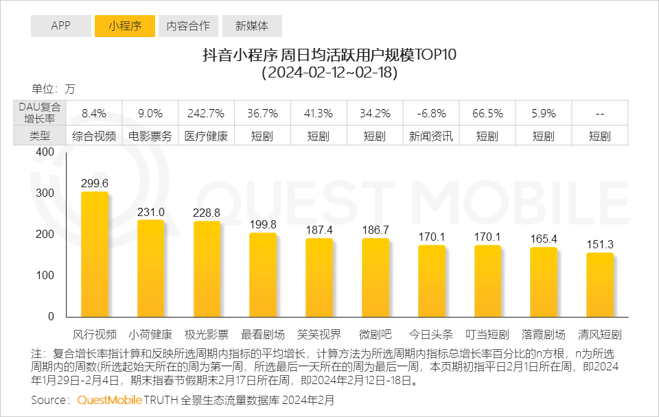 4、春节期间,抖音小程序头部阵营中,短剧类小程序强势崛起,占据 TOP10 中六席,且流量整体攀升;此外,电影票务及医疗健康类小程序亦表现出色