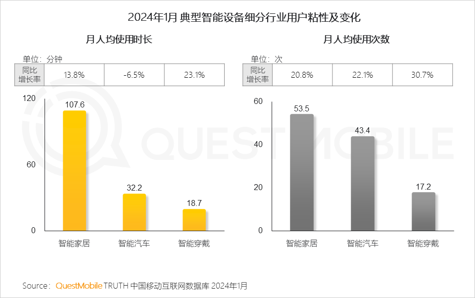QuestMobile数据显示,2024年1月,智能家居、智能穿戴APP行业用户月人均使用时长及次数均实现双增长,智能汽车APP行业月人均使用次数达43.4次,同比提升22.1%。