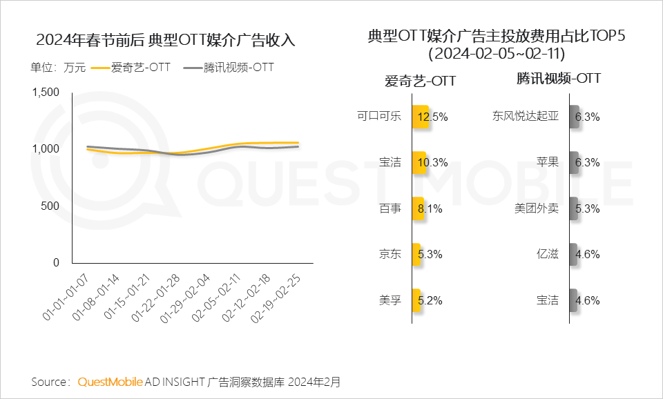 QuestMobile数据显示,以爱奇艺和腾讯视频OTT端媒介广告收入为例,进入2024年以来每周均达到千万级广告营收,除夕所在周(即2024年2月5日-11日)迎来小幅提升,食品饮品、快消品及汽车品牌在春节期间加强在OTT端的广告投放。