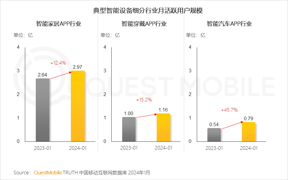 QuestMobile数据显示,2024年1月,智能家居、智能穿戴及智能汽车APP行业活跃用户规模为2.97亿、1.16亿及0.79亿,同比提升分别为12.4%、15.2%和45.7%。