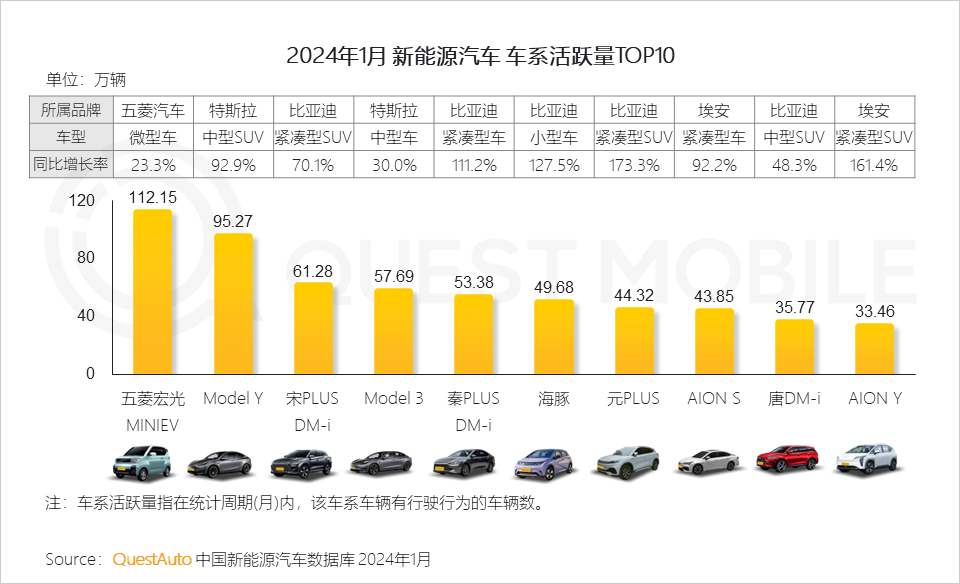 6、车辆行驶活跃折射用户真实使用情况,QuestAuto数据显示,2024年1月,五菱宏光MINIEV、Model Y、宋PLUS DM-i等五款新能源汽车活跃量均超50万辆