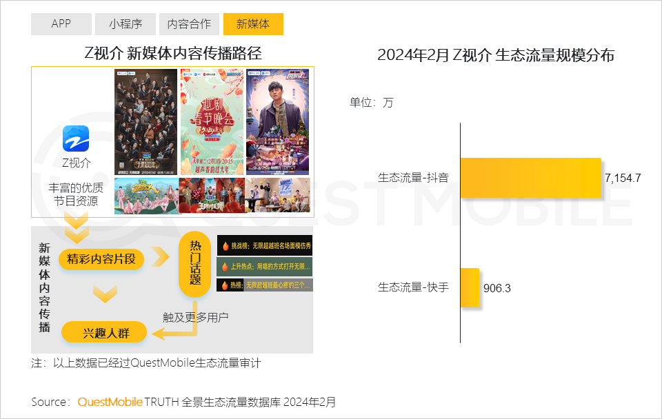 QuestMobile数据显示,2024年2月,Z视介在抖音、快手生态流量分别达到7154.7万和906.3万。