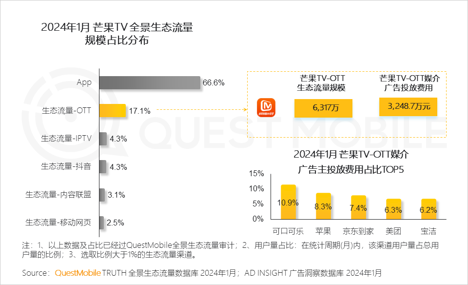 4、OTT端为芒果TV带来超6000万生态流量的同时,吸引多元化广告主,涵盖了可口可乐、宝洁等传统品牌及京东到家、美团等互联网品牌