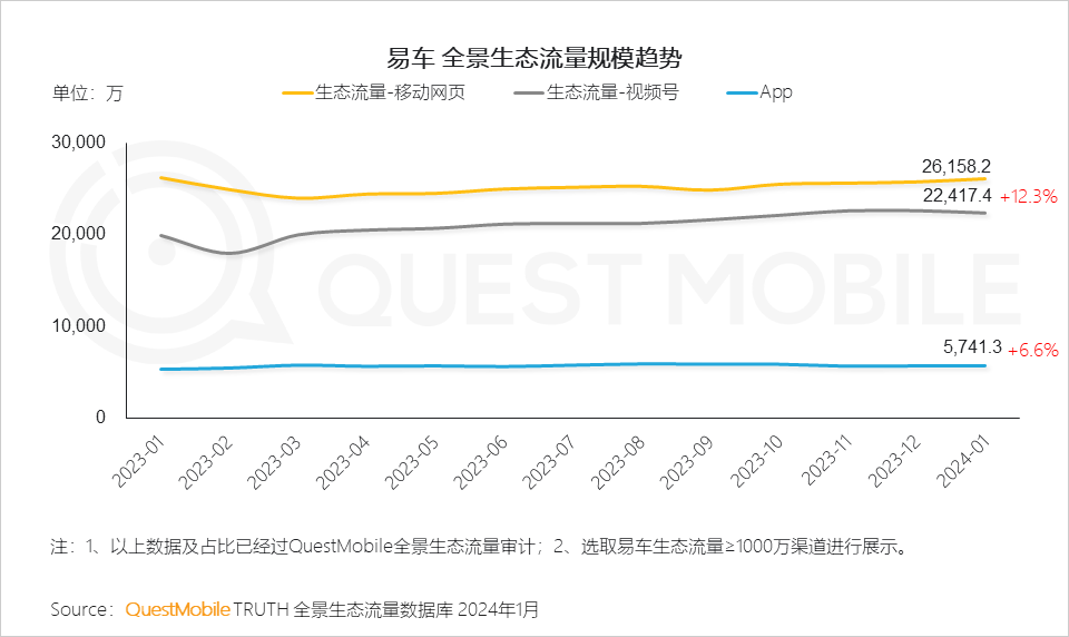QuestMobile数据显示,2024年1月,易车在视频号生态流量已达2.24亿,同比提升12.3%。