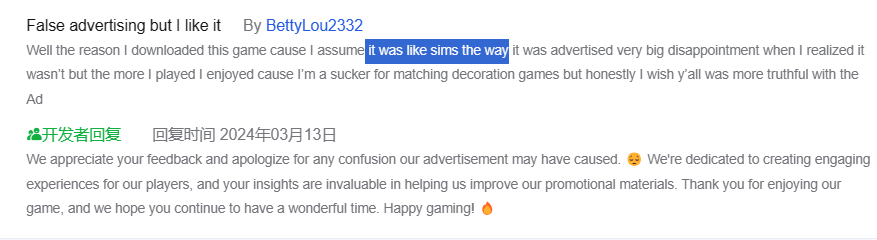 在《Modern Community》的评论区,能看到大量提及《模拟人生》的用户评论。不少用户是抱着玩《模拟人生》的预期进入游戏,然后发现这它原来是一款三消游戏。