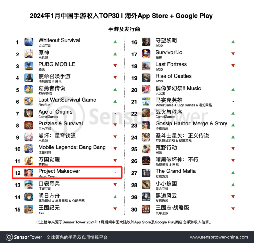 2024年1月中国手游海外收入Top 30 |图片来源:Sensor Tower