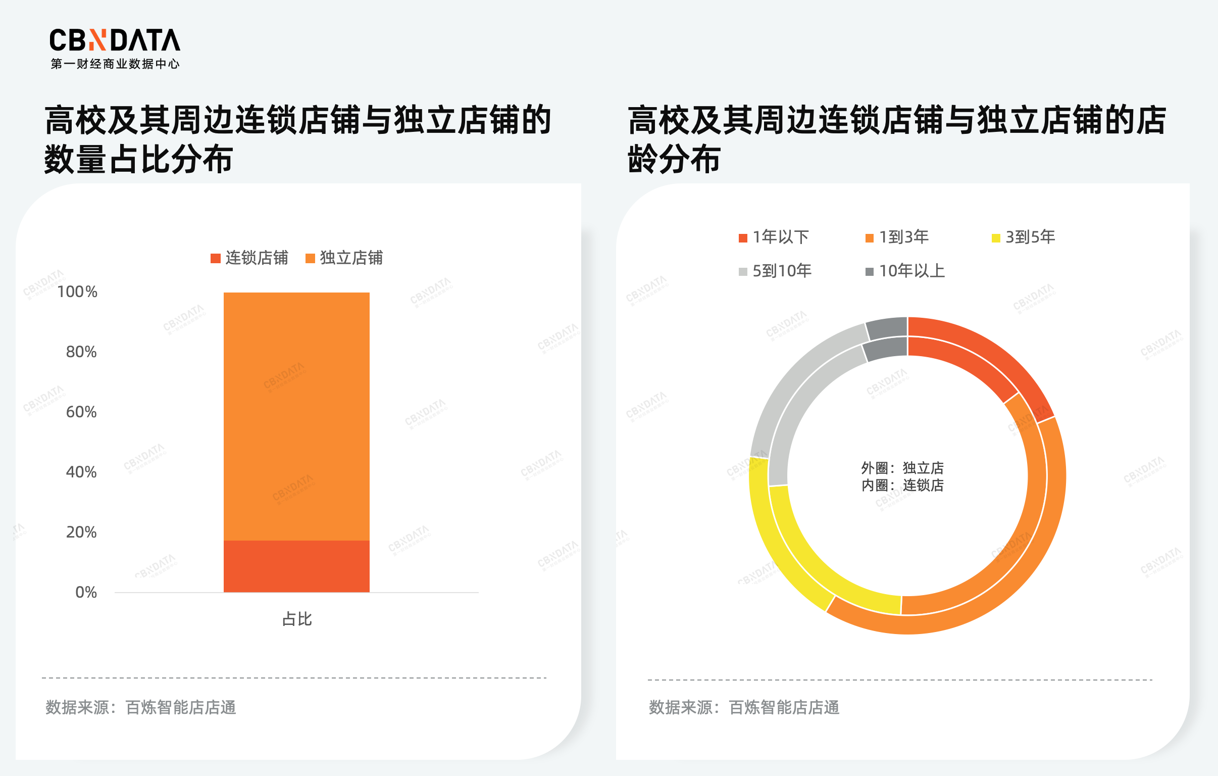 高校周边区域,独立店铺以绝对数量优势占据着主导地位,连锁店占比远低于全国餐饮连锁率。近年来,随着加盟潮愈演愈烈,中国餐饮行业的连锁化率呈现持续上升。根据中国烹饪协会发布的《2023年中国餐饮大数据白皮书》,全国的餐饮连锁率已达34.3%。然而,学校周边连锁率仅有17.5%。尽管如此,连锁店铺凭借品牌效应、规模经济和成熟的管理体系,在经营稳定性方面具有明显优势,往往能更有效地抵御市场风险。因此,在长期运营方面,连锁店铺中经营时间超过10年的“老店”占比相对较高。